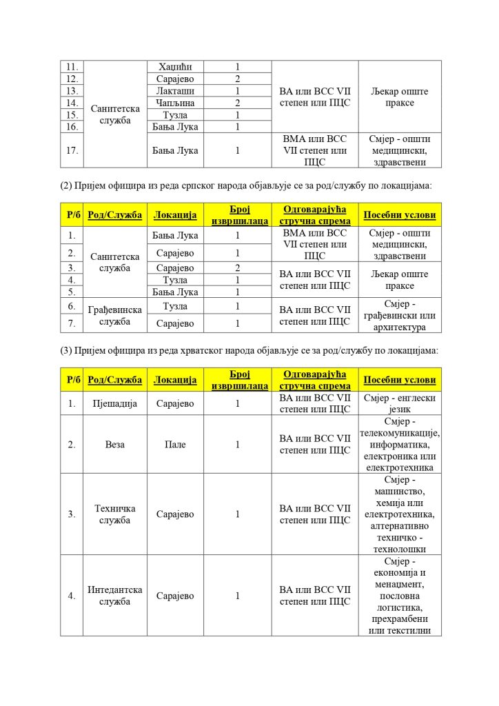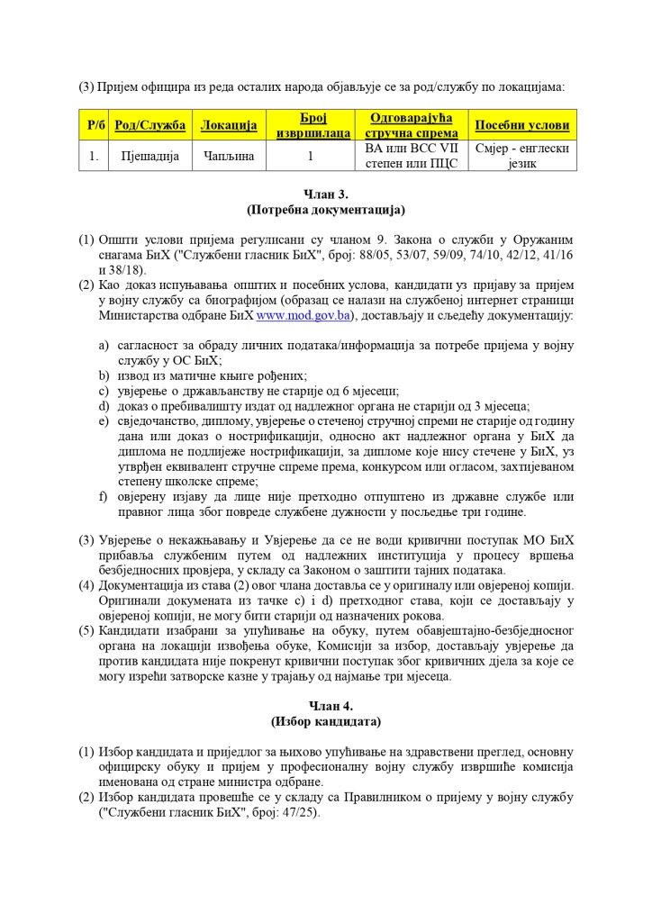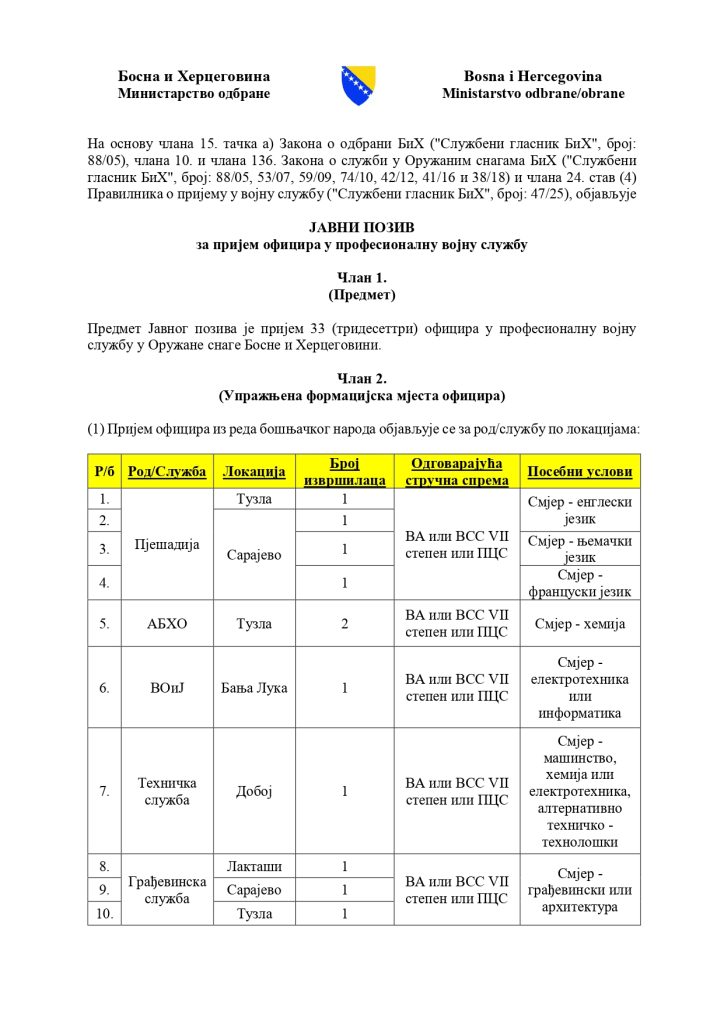 Javni oglas za popunu upražnjenih radnih mjesta zaposlenika u Ministarstvu odbrane BiH i civilnih lica na službi u Oružanim snagama BiH