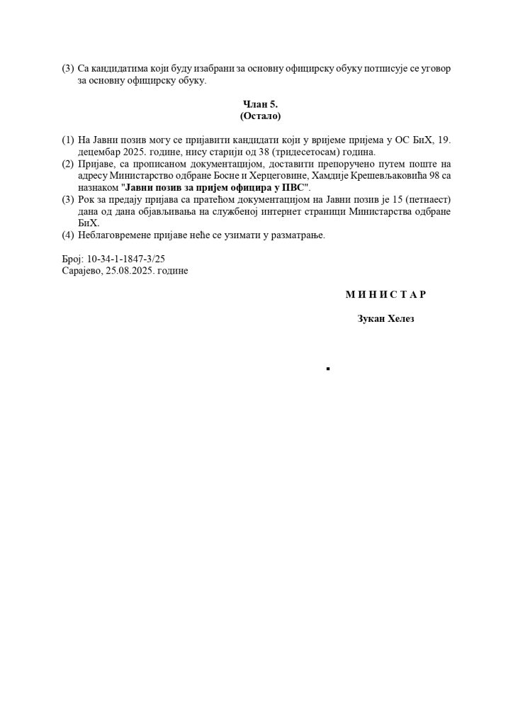 OGLASI Ministarstvo odbrane BiH raspisuju konkurs za prijem oficira u profesionalnu vojnu službu OS BiH Prijava, Saglasnost, Biografija, Izjava Redakcija portala Busovacki.ba Continue Reading Previous Busovljak Almir Kulić osvojio dva prva mjesta na turniru u streljaštvu “SHOOT OFF” i “PRECIZA”Next MIZ Busovača: Centralni program povodom rođenja Muhammeda a.s. održan u Sulejman-begovoj džamiji VIŠE OBJAVA OGLASI Javni oglas za popunu upražnjenih radnih mjesta zaposlenika u Ministarstvu odbrane BiH i civilnih lica na službi u Oružanim snagama BiH OGLASI Konkurs Fondacije “Selamet” za dodjelu stipendija za školsku 2025./2026. godinu OGLASI Zavod za zdravstveno osiguranje SBK raspisuje konkurs za prijem dva izvršioca na neodređeno vrijeme